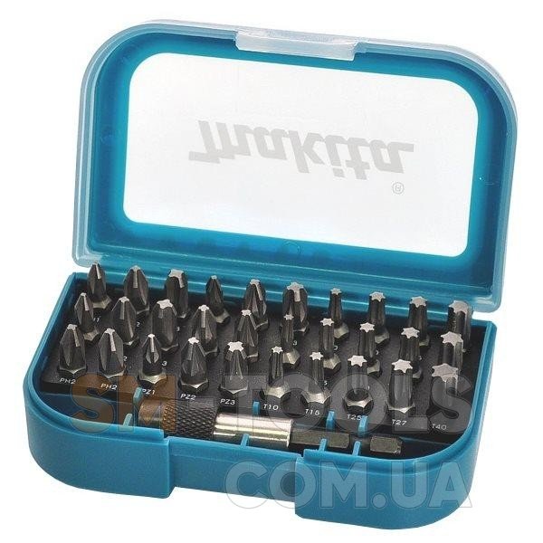 Набор бит с держателем производства Makita применются для монтажных и демонтажных работ. Надежно и прочно фиксируются в патроне шуруповерта или дрели . А точность изготовления повышает износостойкость и надежность бит. Биты: 2xPH1, 4xPH2, 2xPH3, 2XPZ1, 4xPZ2, 2xPZ3, 1xT8, 2xT10, 2xT15, 2xT20, 3xT25, 1xT27, 2xT30, 1xT40, держатель.