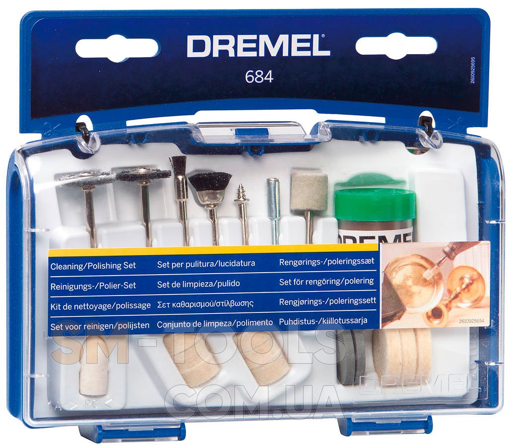 Отличный комплект Dremel (26150684JA) для чистки и полировки, заключено в удобном чемоданчике. В наборе присутсвует 12 различных насадок. Мобильный чемоданчик оснастки – отличное решение для хранения инструмента.