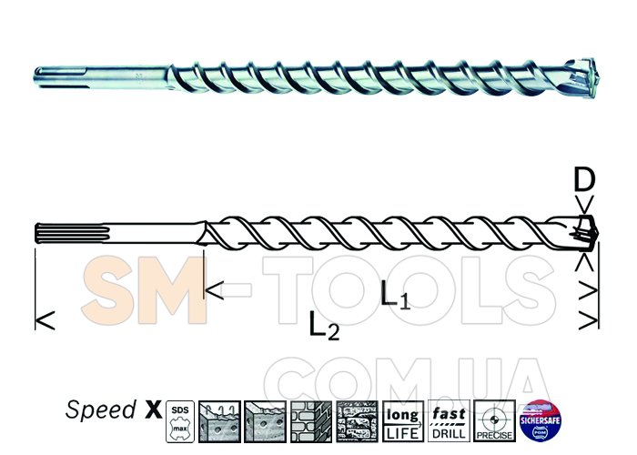 Бур сверло для перфораторов SDS-max применяемое при сверление бетона, армированного бетона, кирпичной кладки, силикатного кирпича.