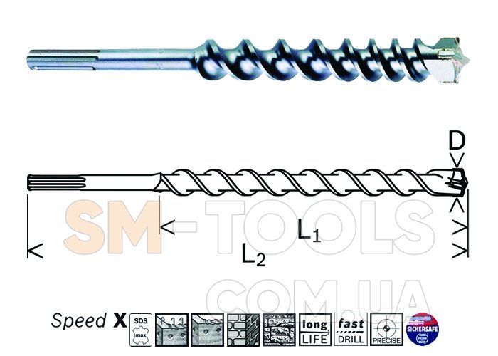 Четыре твердосплавный режущих кромки расположены под агрессивным углом и способствуют высокой эффективности сверления. Конструкция основания и двойной спирали позволяет максимально передавать ударно-вращательное усилие производимое инструментом на ударное сверло. Для эффективного засверливания наконечник режущей кромки выполнен в виде центрирующего острия. Высококачественная сталь повышенной твердости и мелкой зернистости обеспечивает высокую износостойкость и длительный срок службы сверла. Индикатор износа на основании перфораторного сверла сигнализирует о изменении диаметра.