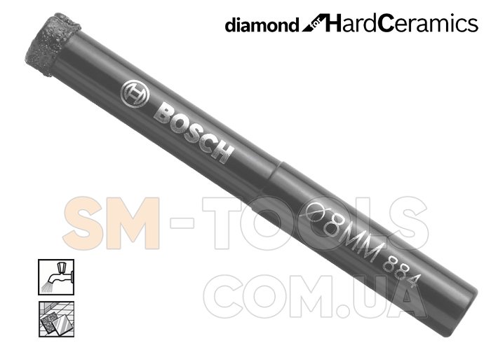 Сверло алмазное Bosch Diamond for Hard Ceramics - качественное и точное сверление керамической плитки без сколов благодаря алмазному покрытию режущей кромки. Специальные отверстия в теле цилиндра для беспрепятственного удаления выработанного материала. Цилиндрический хвостовик для точного осевого вращения диаметром 10 мм. Алмазные коронки предназначены только для сверления с подачей в рабочую зону охлаждающей жидкости (воды). Рекомендуется использовать с безударными аккумуляторными шуруповертами с ограничителем усилия крутящего момента для защиты при подклинивании и оборотах вращения не более 1500 об/мин.