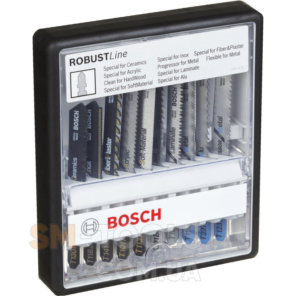 Наборы лобзиковые пилы Bosch из 10 пильных полотен Robust Line Top Expert. Профессиональные пильные полотна для лобзика для различных материалов: керамике, нержавеющей стали, пластике, ламинату, алюминию, металлу и дереву.