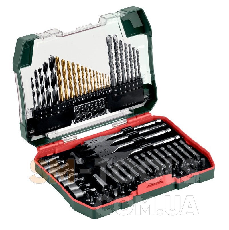 Большой набор принадлежностей Metabo Promotion 86 шт. (626708000) поставляется потребителям в прочном пластиковом кейсе с двумя защелками и надежной рукоятью. Инструменты в чемодане размещены в индивидуальных гнездах и промаркированы, что упрощает поиск приспособления необходимого типоразмера. Принадлежности из данного кейса предназначены для работы с крепежами и высверливания отверстий в камне, металле и дереве.