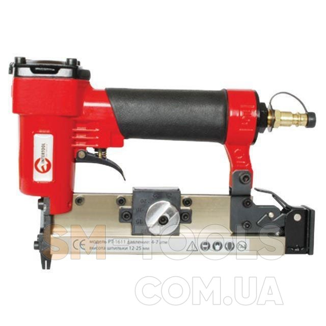 Пневматический степлер РТ-1611 рассчитан на работу со шпилькой высотой от 12 до 25 мм. Применяется в основном в мебельной промышленности, а также для некоторых видов строительных и отделочных работ. Давление сжатого воздуха от компрессора величиной 7 атмосфер передает необходимую силу для пробивания даже твердых пород древесины и ДСП. Степлер РТ-1611 оснащен обрезиненной рукояткой, которая не утомляет руку и способствует длительной и качественной работе с аппаратом. Одними из его главных преимуществ является механизм быстрой загрузки расходных материалов. Данный степлер имеет удобный, эргономичный дизайн — работать с ним эффективно, и одновременно с этим, комфортно. Этот инструмент способен значительно уменьшить трудозатраты и повысить производительность работы.