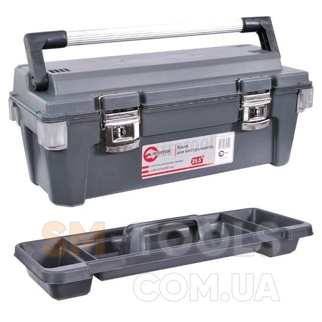 Ящик для инструментов BX-6025 – это надежный и верный помощник для хранения и транспортировки вашего инструмента. Если вы привыкли, что ваш инструмент был всегда под рукой, то ящик BX-6025 это то, что вам нужно. Габаритные размеры 650*275*265 позволяют разместить достаточное количество инструментов. На ящике предусмотрены петли для навесных замков, повесив которые Вы сможете обеспечить дополнительную сохранность содержимого. Ящик имеет длинную рукоятку для ношения, которая оснащена алюминиевой накладкой. Длинная рукоятка максимально балансирует в руке ящик с инструментами, а на запястье идет минимальная нагрузка. BX-6025, как и большинство других ящиков INTERTОOL имеет лоток с ручкой.