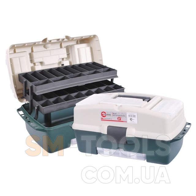 Многофункциональный ящик для инструментов BX-6121 имеет множество дополнительных отсеков для мелких деталей и для небольших ручных инструментов, а также расходных материалов. Ящик изготовлен из прочного пластика, имеющего матовую текстуру. В свою очередь, матовая текстура максимально скрывает все небольшие царапины, которые могут образоваться в процессе эксплуатации. На крышке ящика имеются три небольших органайзера, два из которых съемные. И один органайзер располагается в нижней части ящика, его тоже можно извлекать из своего посадочного места. Открыв крышку ящика, можно увидеть два раздвижных отсека. Замок ящика широкий и прочный. Он максимально плотно прижимает крышку ящика к корпусу. Габаритные размеры ящика составляют 530*270*245 мм.