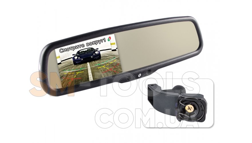 Яркость встроенного дисплея диагональю 4,3" составляет 1000 cd/m2. Это позволяет получить яркое и четкое изображение через зеркальную поверхность. Включить и выключить монитор возможно с помощью кнопки, расположенной на корпусе зеркала. При отображении видео с автомобильной видеокамеры заднего вида эта кнопка выполняет функцию регулировки яркости встроенного дисплея.