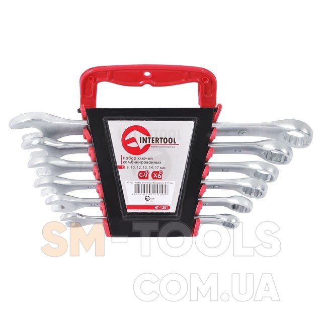 INTERTOOL HT-1201 — это набор из 6 комбинированных ключей, каждый из которых представляет собой сочетание рожкового и накидного гаечного ключа. Размерная линейка набора — от 8 до 17 мм. Обе стороны ключей имеют одинаковый размер головки. Рожковая сторона ключей является самой популярной среди соединений и имеет обширную область применения. Накидная сторона ключей, благодаря кольцевому строению, в момент приложения усилия позволяет распределить нагрузку равномерно. Это снижает риск «слизать» грань угла. Ключи изготовлены из хром-ванадиевой стали. Ÿ физические и химические свойства обуславливают высокую устойчивость к механическим нагрузкам, коррозионную стойкость и твердость. Кроме того, эта легированная сталь обладает благоприятным модулем упругости. Удобная форма ключа обеспечивает оптимальные условия для приложения усилия. Ключи поставляются в удобном пластиковом держателе с ручкой и отверстием для подвешивания.