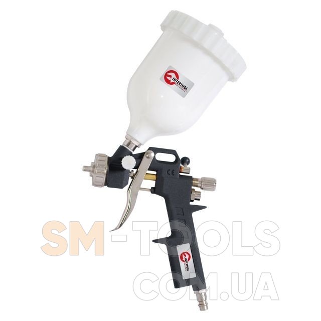 Краскораспылитель пневматический INTERTOOL PT-0210 изготовлен с использованием технологии НР (High Pressure — высокое давление при малом расходе воздуха). Данный краскораспылитель комплектуется верхним пластиковым бачком объемом 600 мл. Размер форсунки краскораспылителя РТ-0205 составляет 1,5 мм, а расход воздуха 130-190 л/мин. Рабочее давление агрегата достигает 5 атм. Краскопульт INTERTOOL PT-0210 оптимально подходит для проведения покрасочных работ при которых не требуется идеальное нанесение материала на поверхность, но важна скорость и площадь покрытия.