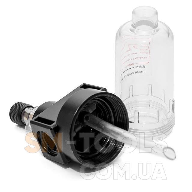 Лубрикатор Intertool PT-1420 используется в разлиных пневмоинструментах для подачи масла. Корпус устройства выполнен из прозрачного пластика.