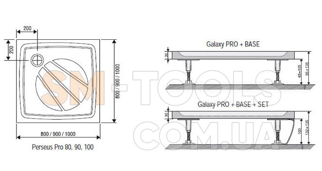 Для встановлення піддонів серії Galaxy PRO на підлогу ванної кімнати необхідно використовувати набір ніжок (Galaxy PRO BASE) та за бажанням передню панель з гачками (SET).