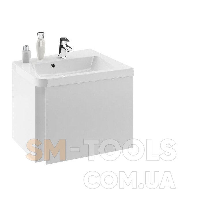 Подвесная тумба под угловой умывальник с большим внутреннем пространством и практичным ящиком для хранения мелких вещей в размере 550×485×450 мм, цвет белый.