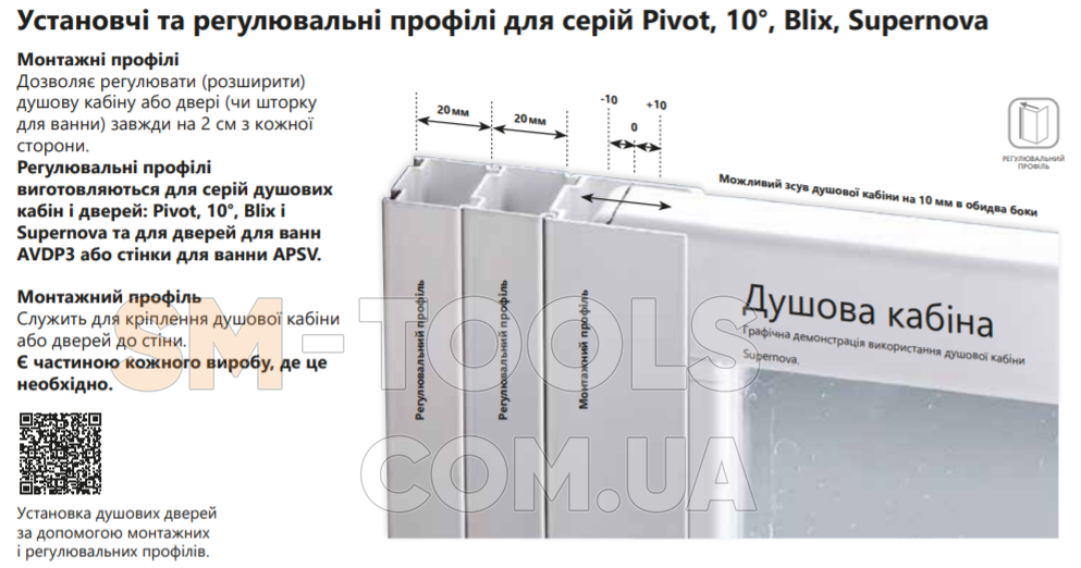 УВАГА! Виріб складається з двох рівних нерухомих частин і чотирьох рухомих частин. За допомогою регулювальних профілів NPS душову кабіну можна адаптувати до нестандартних розмірів будівельного отвору. Радіус 500 мм. Встановлюється в облицьований кахлем кут ванної кімнати на піддони RAVAK Ronda, Elipso, Elipso Pro, Elipso Pro Flat, Elipso Pro Chrome або безпосередньо на підлогу з вбудованим душовим каналом або трапом.