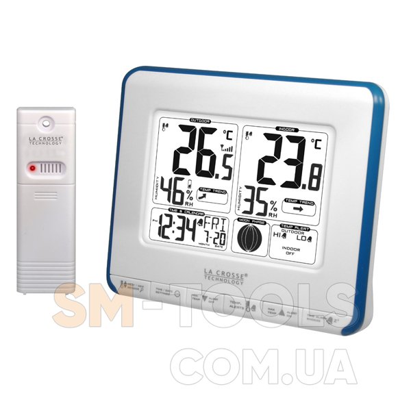 Метеостанция La Crosse WS6812WHI-BLU измеряет температуру и относительную влажность внутри и снаружи помещений, а так же определяет температуру точки росы (Dew Point) и индекс теплового комфорта (Heat Index).