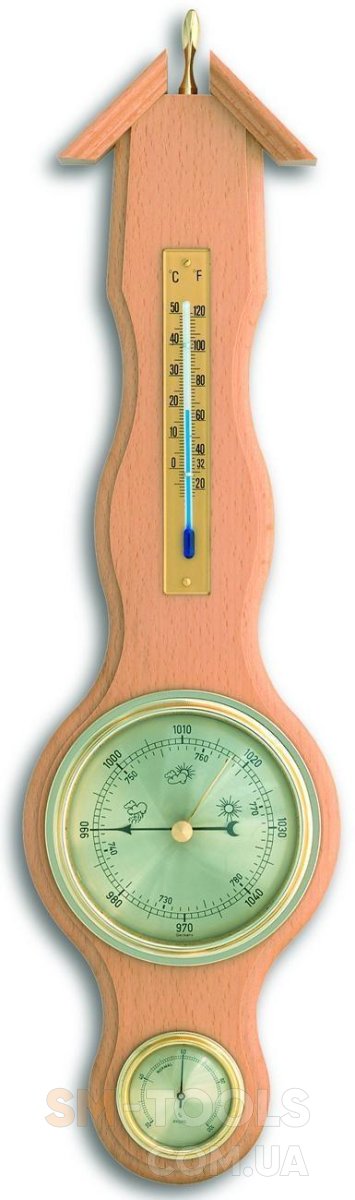 Используется внутри помещения, измеряет атмосферное давление, температуру от -5°C до +50°C и относительную влажность воздуха от 20 до 100%. Материалы изготовления — дерево, бук. Настенная установка. Диаметр циферблатов: гигрометр — 45 мм; барометр — 105 мм. Жидкостный термометр.
