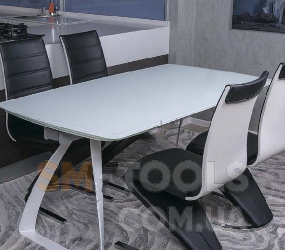 Столешница выполнена из закаленного прозрачного стекла, а основание - металлическое, окрашенное в белый цвет.