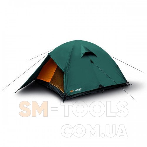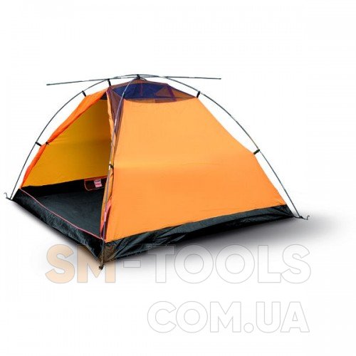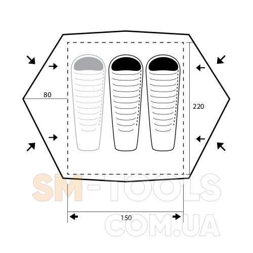 Палатка для 2-3 человек с двумя входами. Два тамбура обеспечивают достаточно пространства для багажа. Двухдуговая конструкция обеспечивает устойчивость к порывам ветра. Третья маленькая дуга предназначена для увеличения тамбуров.