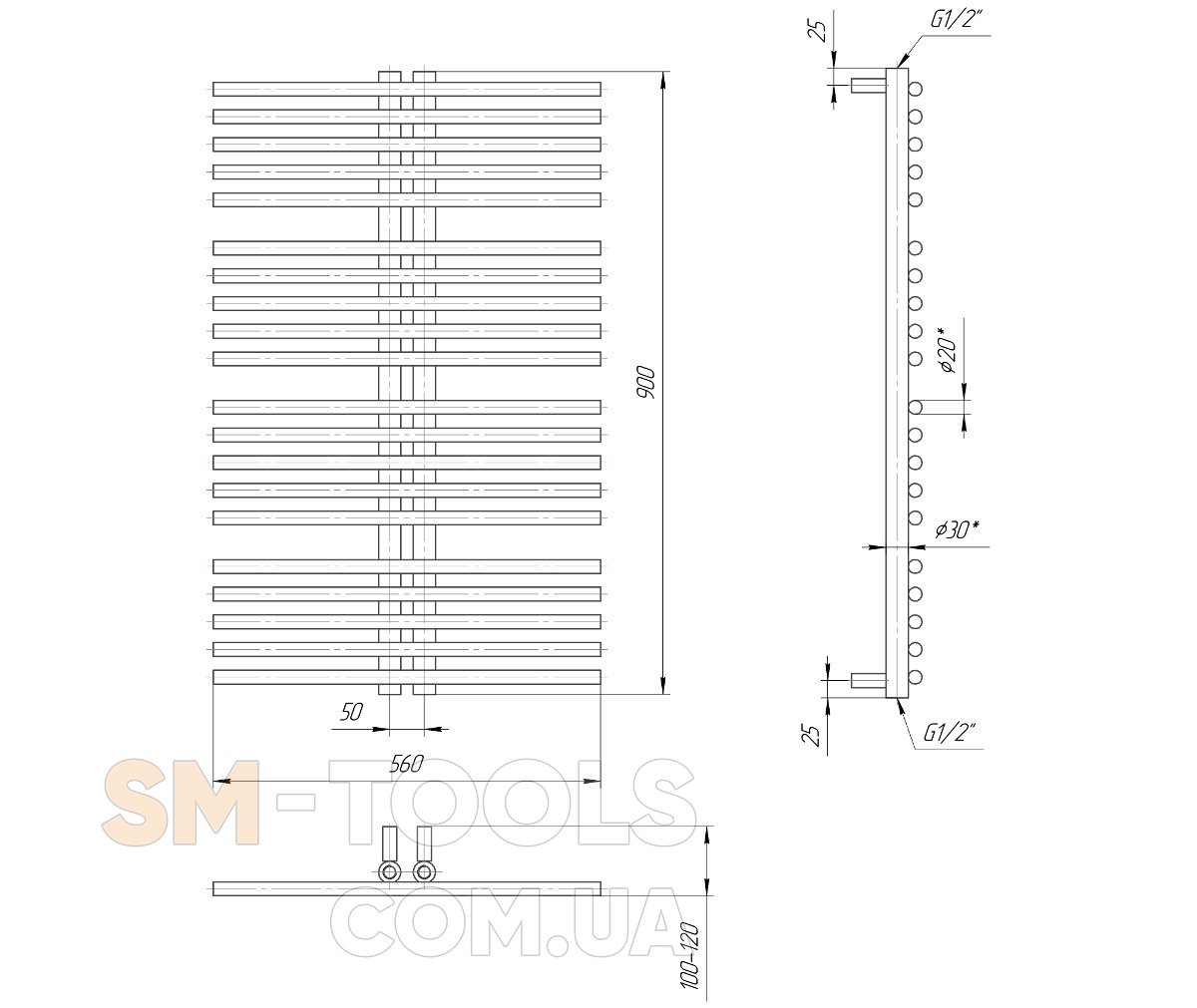 Водяной полотенцесушитель Рим 900x560 с межосевым растоянием для подключения 50мм, диметр подключения G 1/2'' состоит из 20 ребер. Полотенцесушитель Рим производсветнного предприятия Mario изготовлен из нержавеющей стали АІSI 304 может быть оборудован 300W электрическим теном.