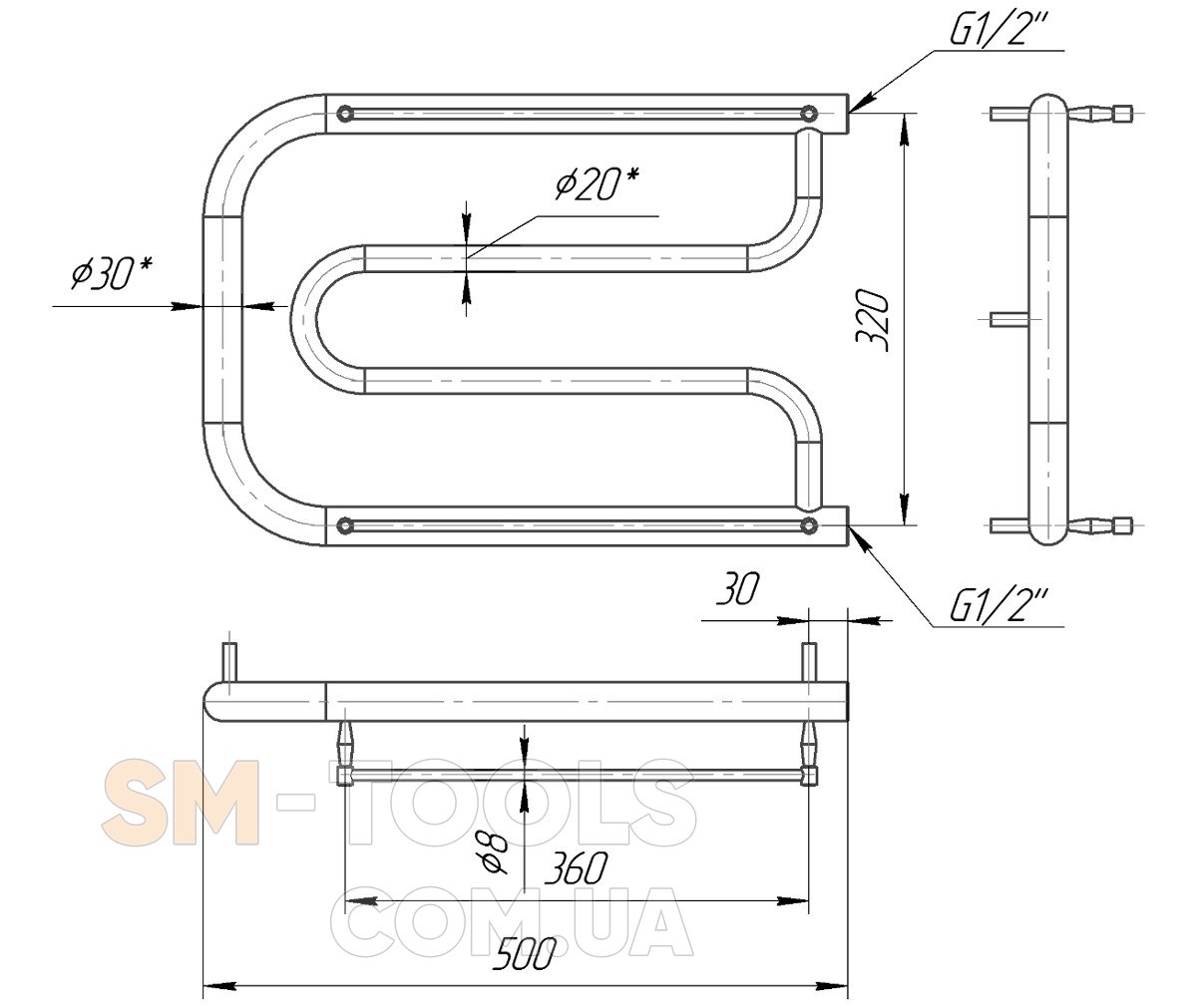 Водяной полотенцесушитель Фокстрот 320х500 с межосевым растоянием для подключения 320мм, диметр подключения G 1/2'' состоит из 1 гиб ребер. Полотенцесушитель Фокстрот производсветнного предприятия Mario изготовлен из нержавеющей стали АІSI 304 может быть оборудован W электрическим теном.