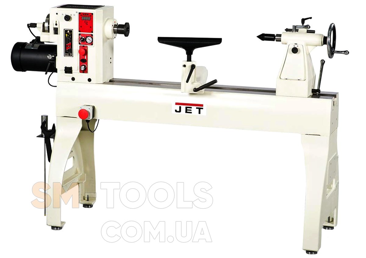 Токарний верстат JET 4224B Powermatic 1794224B-RU – професійне обладнання, яке обробляє поверхні дерев'яних заготовок та обточує деталі. На передній бабці є цифрова індикація частоти обертання, що дозволяє зчитувати значення швидкості. Чавунна станина машини відрізняється високою міцністю та стійкістю до зносу. Вбудована вакуумна система ефективно фіксує заготовки без пошкодження (необхідне підключення до компресора). Передня бабка легко повертається на 180 градусів при необхідності роботи з деталлю діаметром більше 610 мм. Модель комплектується кронштейнами, щоб встановлювати заготовку-зразок, огорожею робочої зони, навісним тримачем для інструментів та вакуумним патроном для фіксації деталей.