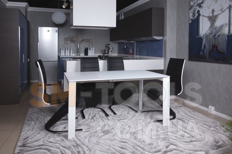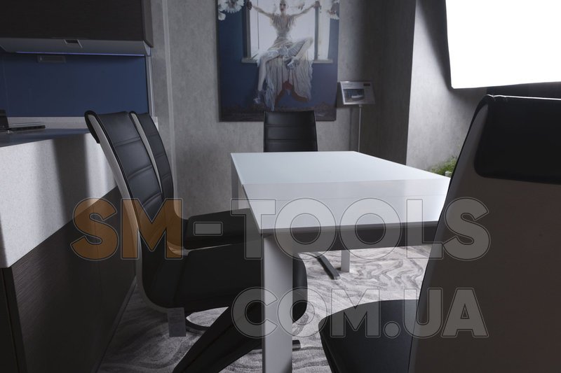 В сложенном состоянии столешница исполнена из закаленного матового стекла цвета графит и имеет сатиновую, приятную на ощупь, поверхность. В разложенном виде - столешница из окрашенного МДФ и закаленного матового стекла.
