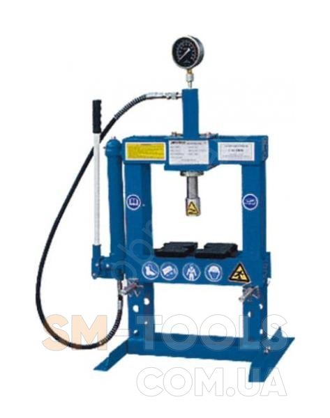 Прес гідравлічний PROMA HLR-10U/2 призначений для запресування, випресування та рихтування деталей. Тиск здійснюється за рахунок гідроциліндра оснащеного рукояткою нагнітання рідини за кілька циклів. Верстат оснащений перепускним клапаном скидання тиску. Головка поршня може переміщатися в горизонтальному напрямку за допомогою рукоятки. Зручний циферблат манометра з великими цифрами показує зусилля тиску, що прикладається до деталі. Є пристосування для контролю деталі та визначення правильної геометричної форми. Робочий стіл регулюється по висоті та фіксується по отворах двома стопорними пальцями. Максимальне зусилля, що розвивається преса 10 т.