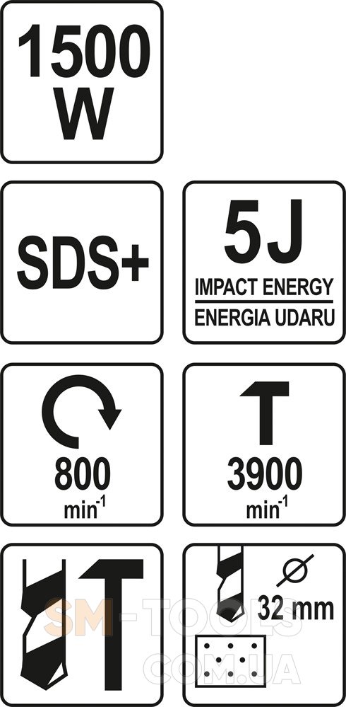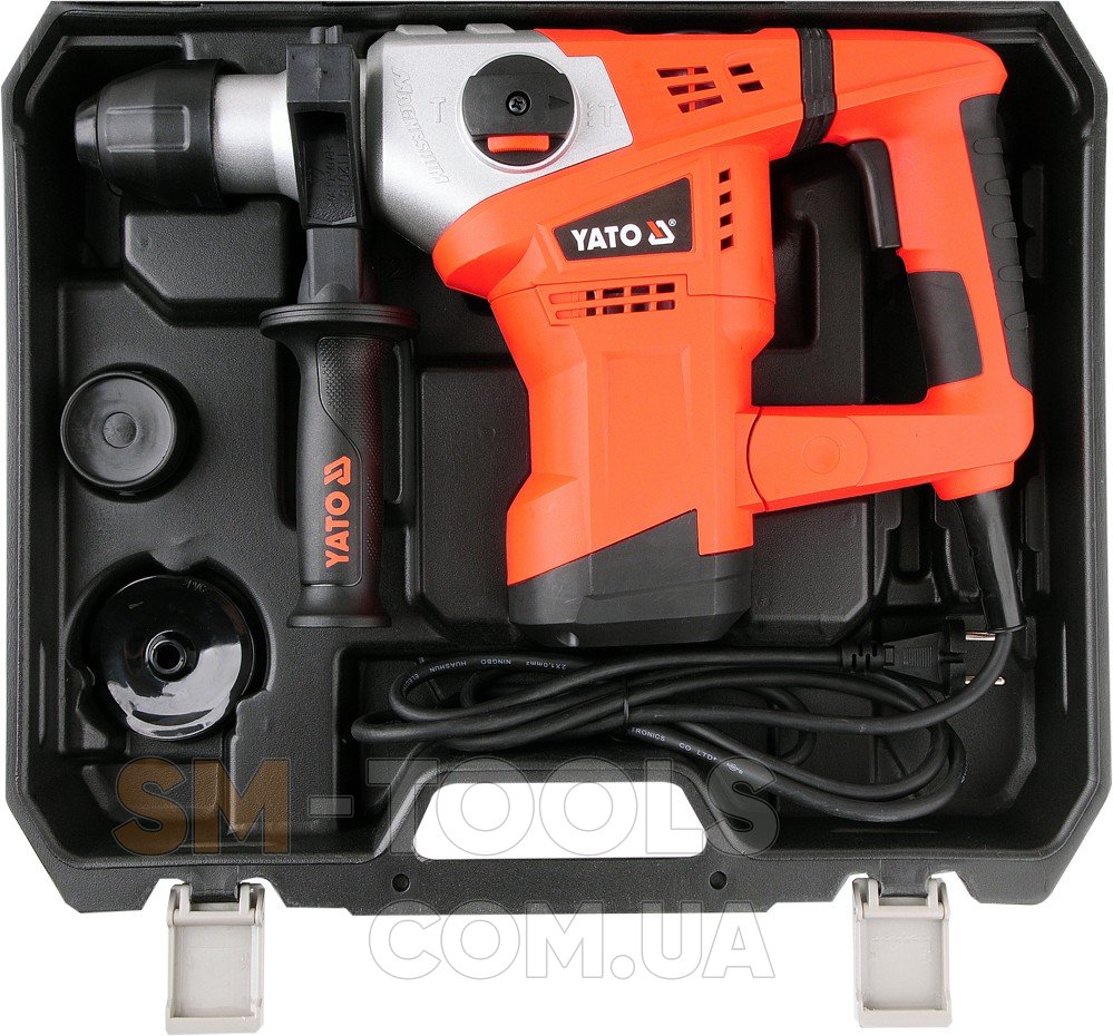 Перфоратор Yato YT-82127 на кшталт кріплення бура/свердла відноситься до категорії - SDS-Plus. Має 2 режими роботи: свердління з ударом, довбання (відбійний молоток). Швидкість роботи – 1. Потужність – 1500 Вт. Енергія удару – 5 Дж. Число ударів – 3900 уд/хв. Кількість оборотів на холостому ході – 800 об/хв. Максимальний діаметр свердління бетону – 32 мм. Вага – 5,7 кг.