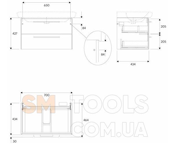 Шафка під умивальник Kolo Life 80 см, 700х434х427 мм, сірий глянець, висувні ящики з механізмом плавного закривання, ДСП, 2 хромовані ручки