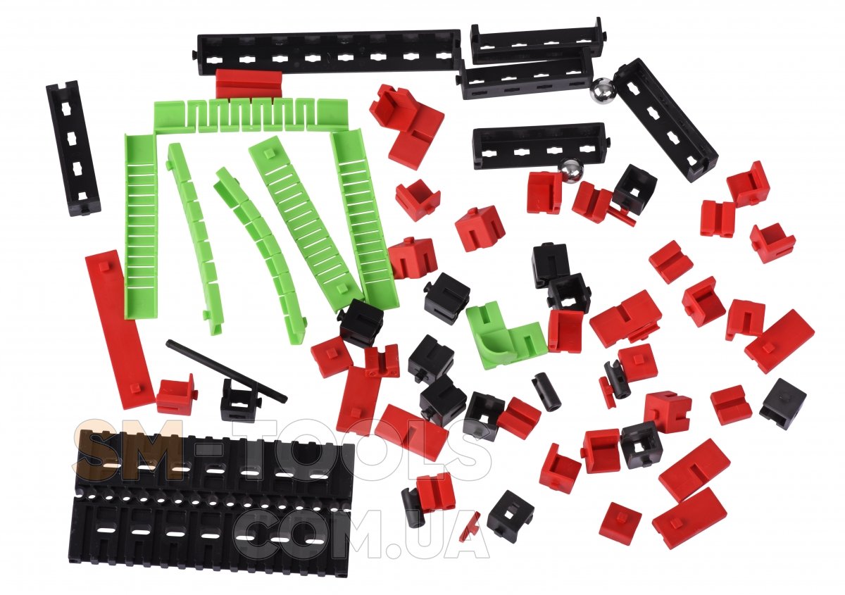 В наборе имеется 70 деталей и пошаговая инструкция, с помощью которой можно собрать три впечатляющие модели: горку с препятствиями, трамплин и игру на ловкость. Шаблоны для игр можно скачать по ссылке и распечатать на принтере.