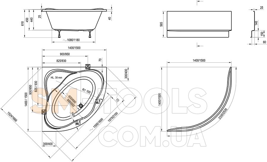 До ванни можна докупити опору, стічний комплект для ванни з переливом або практичні аксесуари – передню панель, підголівники. Ванна оснащена зручним вбудованим сидінням над рівнем води.