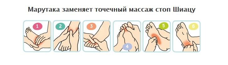 При помощи массажера для ног «Марутака» вы сможете устранить болевые ощущения в ногах и нормализовать артериальное давление. В случае регулярного применения происходит улучшение работы ЦНС и микроциркуляции во всех органах тела. Таким образом, повышается иммунитет, улучшается работоспособность сердечной мышцы и головного мозга, а также реологические показатели крови.