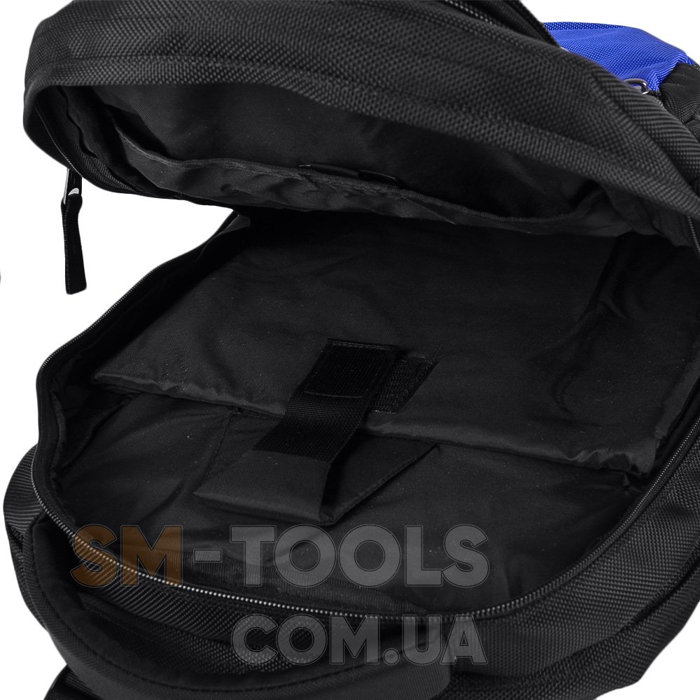 Внутри рюкзака есть: два автономных отделения, один накладной карман на липучке и отделение на липучке для ноутбука с экраном до 15.4".