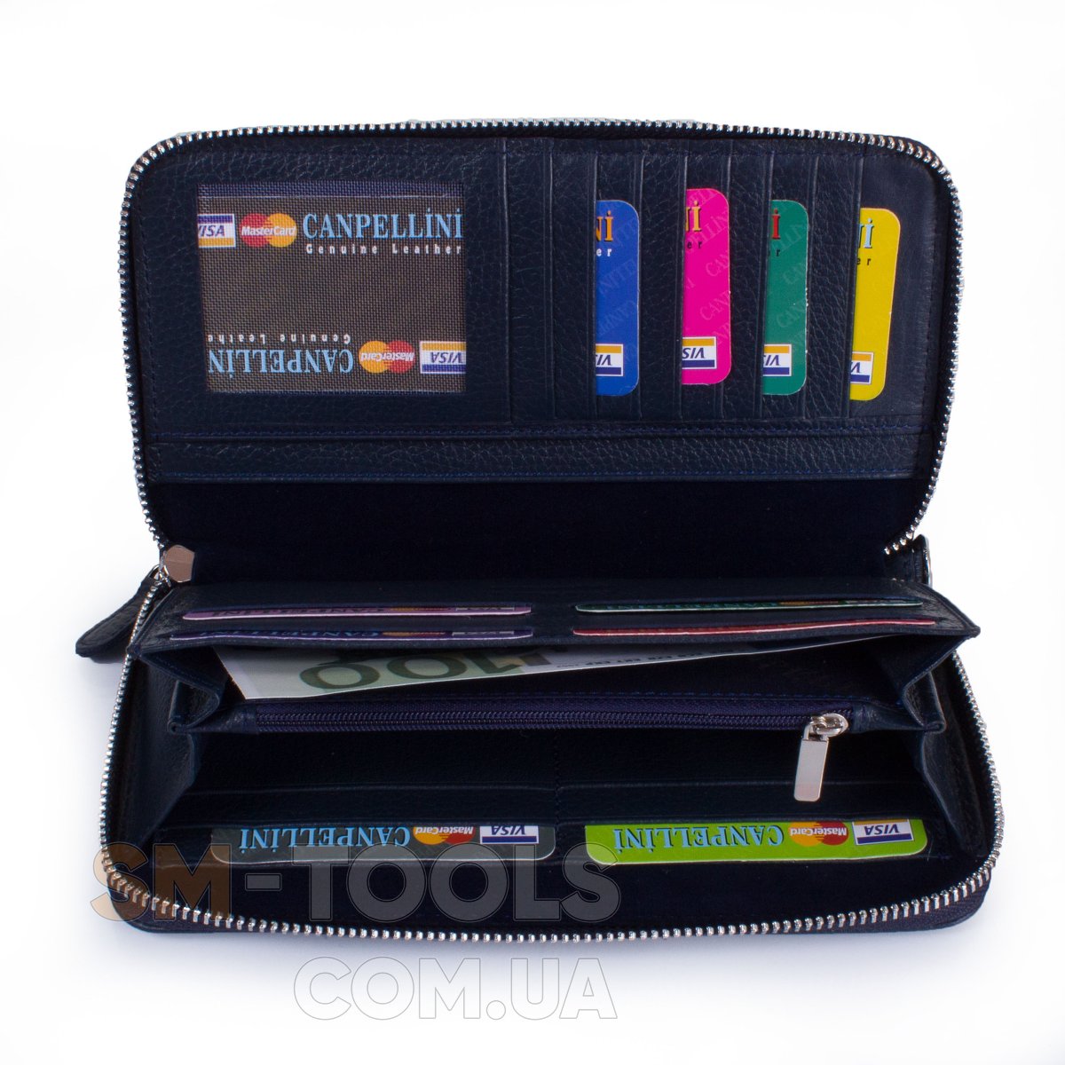 Количество основных отделений (для купюр): 2. Внутри имеется 18 кармашков для визиток, банковских и дисконтных карт, 3 горизонтальных накладных кармана, один карман для пропусков, фотокарт и мелких документов (с прозрачным окошком), карман-перегородка на молнии, держатель для ручек, карандашей и стилусов.