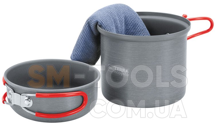 Набор посуды из анодированного алюминия для 1 человека, состоит из котелка, крышки-сковородки и тряпки для мытья посуды. Размер котелка позволяет вложить его внутрь котелка "UNO". Набор упакован в удобный сетчатый чехол.