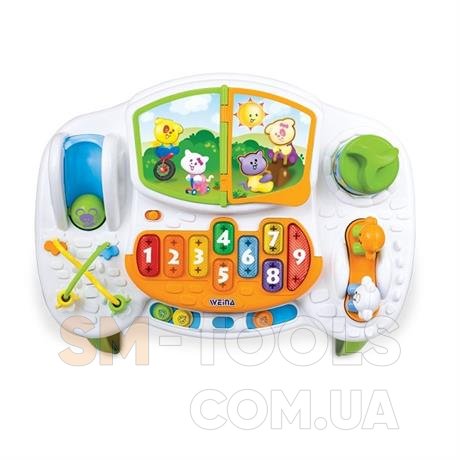 Игровой столик Weina предназначен для детей от 9 месяцев. Он поможет вашему малышу развить мелкую моторику. Ребенок может научиться переворачивать странички в книжки. Покрутив карусельку, он услышит мелодию и увидит мигающие веселые огоньки. Маленькие пчелки, долетев до своей тучки, сообщат ему об этом звуковым сигналом. Поиграв в классики малыш, познакомится с цифрами, цветами, при этом все это будет сопровождаться разными звуками и подсветкой. Если ваш ребенок еще не так уверенно стоит на ножках он сможет использовать игровую панель без ножек, для игры на полу.