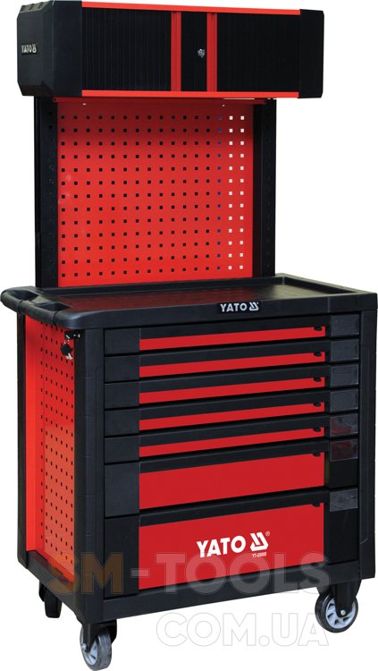Шкаф для инструментов марки YATO оснащен 7-ю ящиками (шухлядами), которые высовываются на шариковых направляющих + две закрытые тумбочки надставки. Профиль корпуса шкафа изготовлен из двойного стального листа. Универсальная перфорация позволяет оборудовать шкаф дополнительными элементами, под индивидуальные требования. Шкаф имеет угловые бамперы, которые защищают от случайного повреждения, например - кузовом автомобиля. Робочая столешница зготовлена из стали и расчитана на 600 кг нагрузки. Такие шкафы, наилучше подходят, для автомастерских и станций обслуживания транспортных средств.