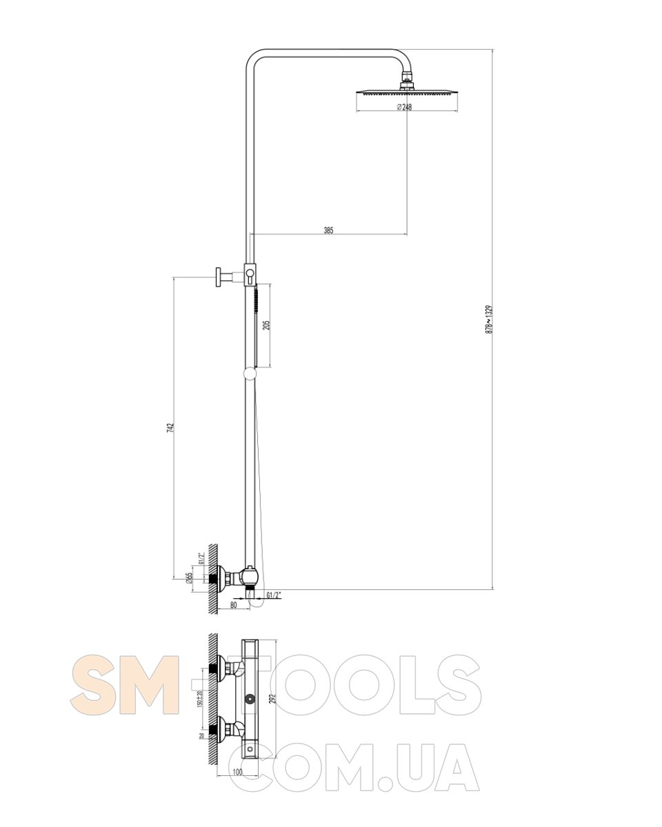 Верхний душ: круглый (248 мм), расход воды до 22 л/м