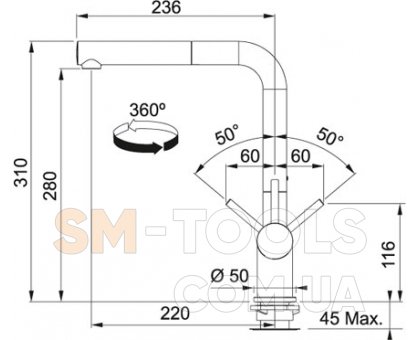 Угол поворота излива 360 °