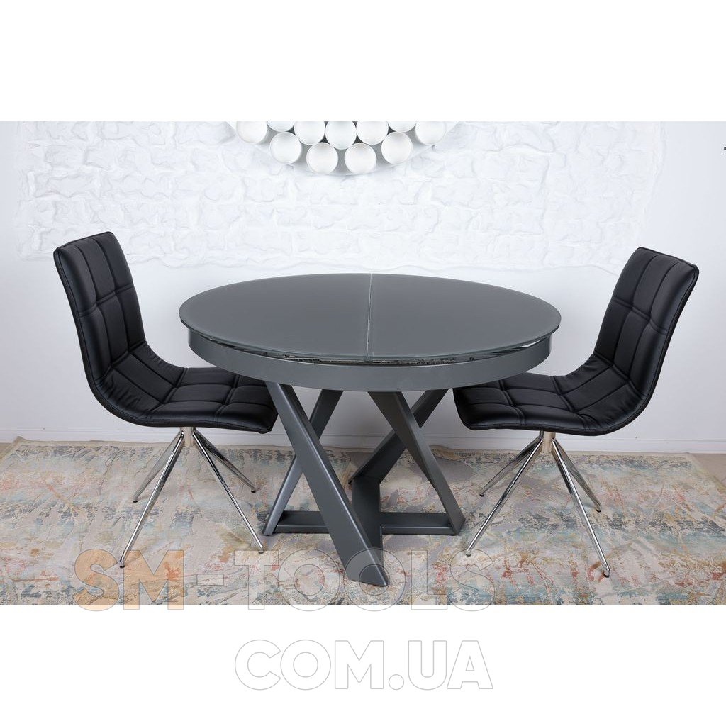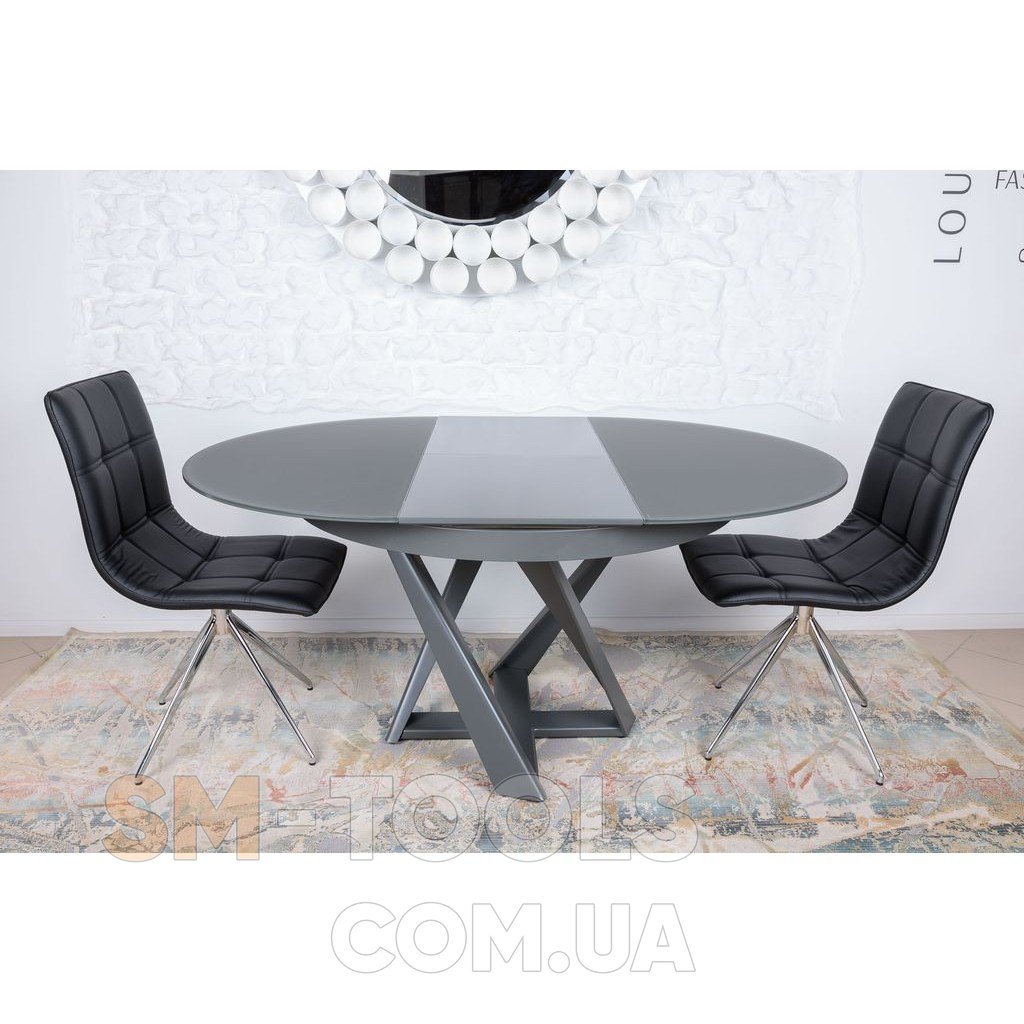 Основная столешница выполнена из матового закалённого стекла 10 мм (обработанное пескоструйным и шелкографным аппаратами) цвета графит. На такой столешнице практически не заметны отпечатки пальцев и следы от посуды, но мы рекомендуем использовать подставки или салфетки под тарелки и столовые приборы. Дополнительные панели располагаются посередине, сделаны из крашенного МДФ в тон столешницы. Чтобы разложить стол, нужно просто раздвинуть стеклянную столешницу и достать вставки.