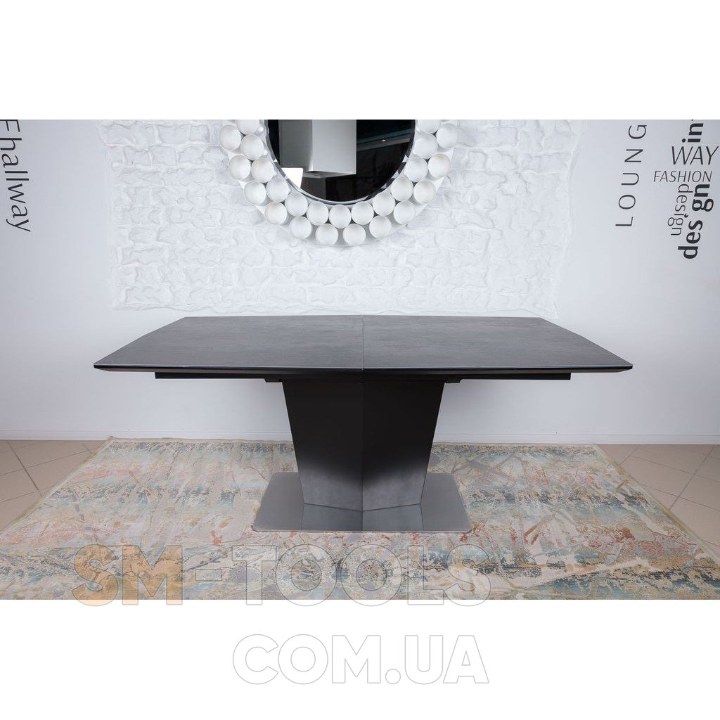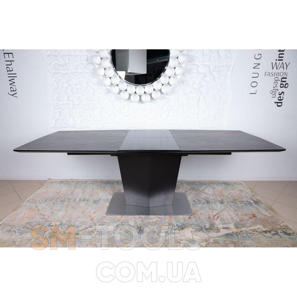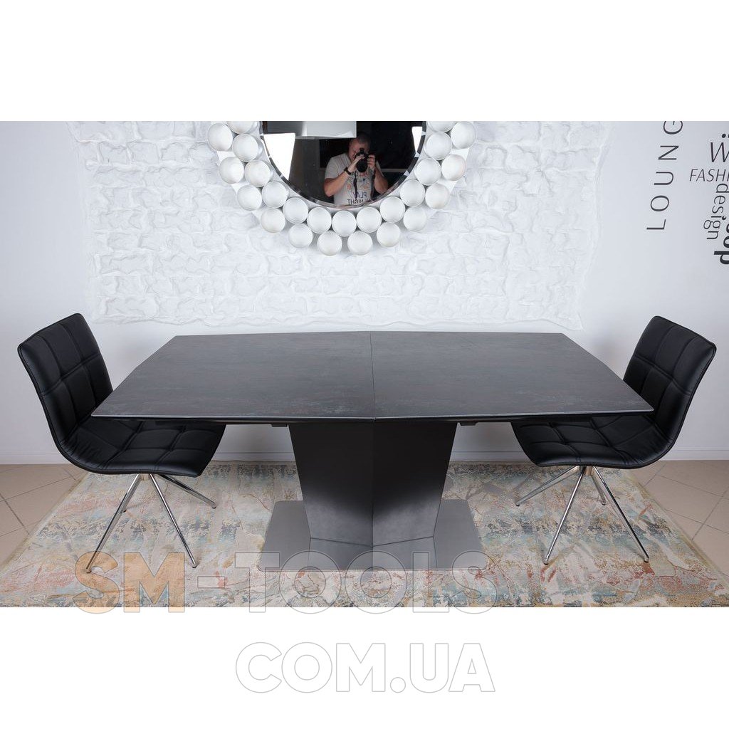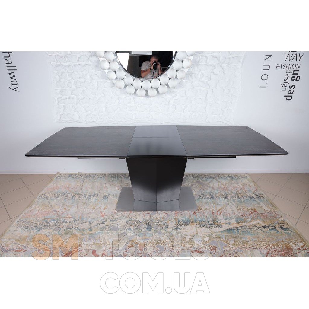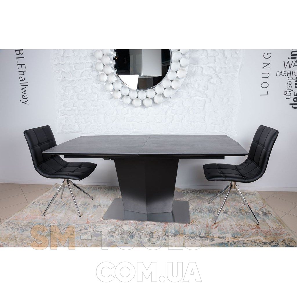 Стол в сложенном виде рассчитан на 6 персон, в разложенном - на 8. Столешница прямоугольной формы со слегка закруглёнными торцами. По стилю стол впишется в любое современное пространство.