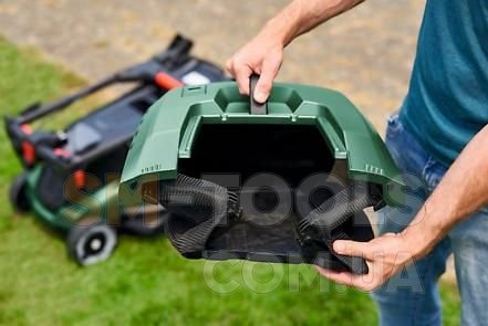 Травосборник сверху пластиковый, а снизу мягкий из специального износостойкого материала. Это позволяет использовать и без того его внушительный объём в полной мере, а также облегчает хранение.